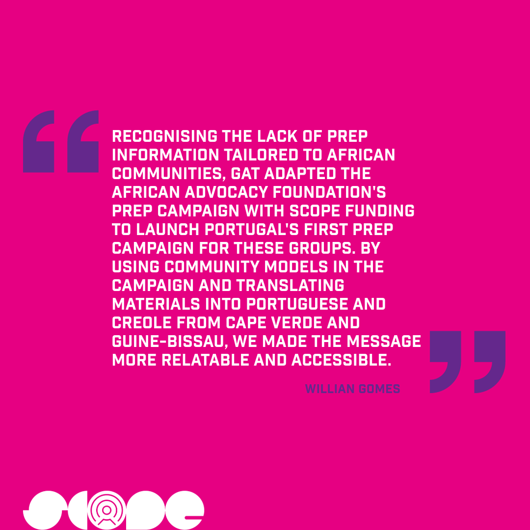 Recognising the lack of PrEP information tailored to African communities, GAT adapted the African Advocacy Foundation’s PrEP campaign with SCOPE funding to launch Portugal’s first PrEP campaign for these groups. By using community models in the campaign and translating materials into Portuguese and Creole from Cape Verde and Guine-Bissau, we made the message more relatable and accessible.