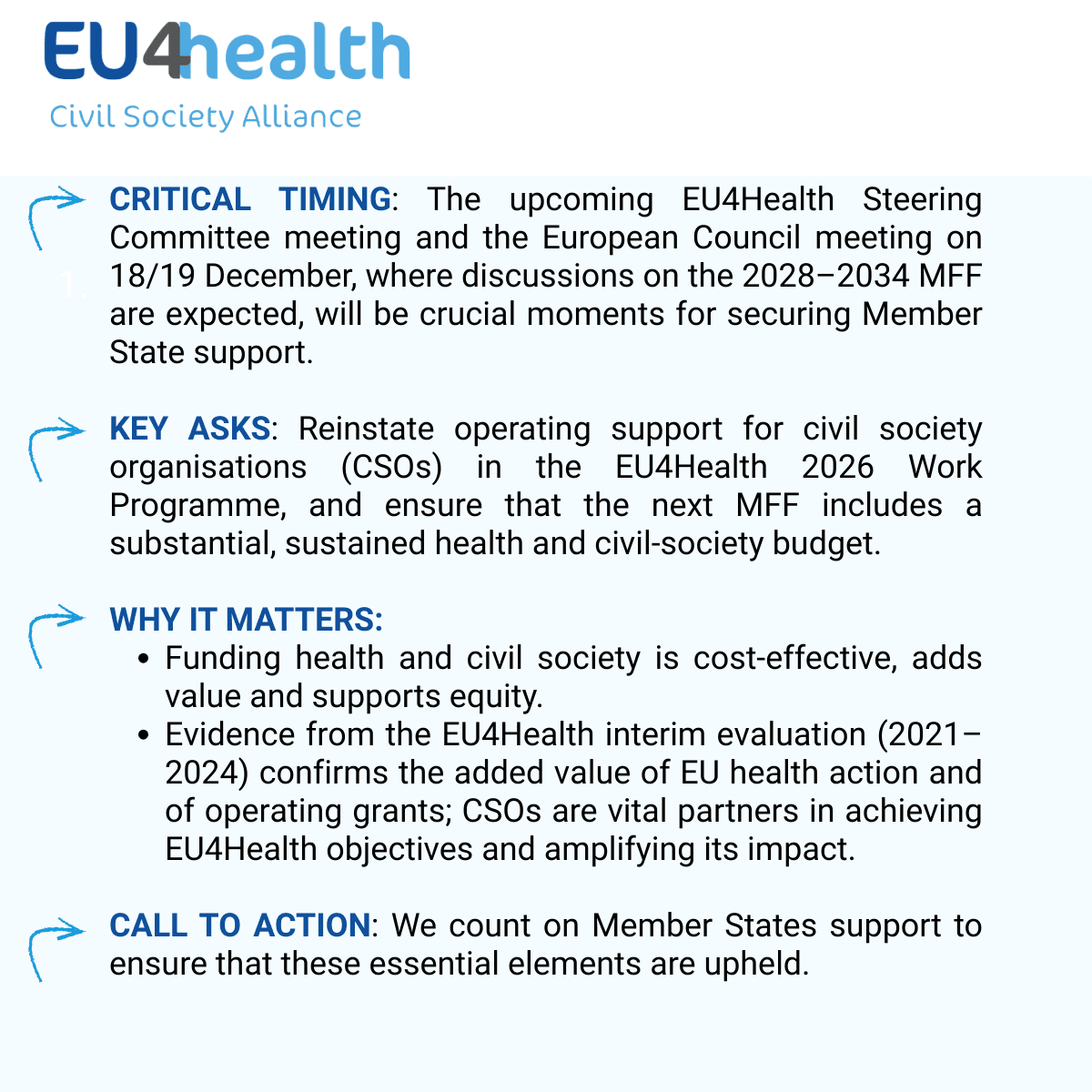 Sustained investment in health and civil society is indispensable to secure Europe’s resilience, social cohesion, competitiveness and future, and to ensure that EU health policymaking remains a democratic process, civil society must have the support to participate effectively and meaningfully.