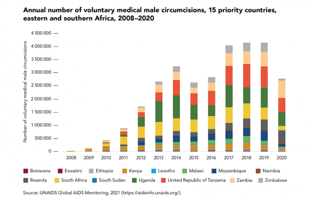 In areas with high HIV prevalence and low rates of male circumcision, voluntary medical male circumcision (VMMC) can greatly contribute to HIV prevention. Despite this, there was a steep drop in the number of VMMCs performed in the 15 priority countries in 2020, due mainly to service disruptions caused by the COVID-19 pandemic: approximately 2.8 million procedures were performed in 2020, compared with 4.1 million in 2019.