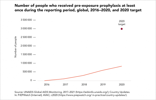 There continue to be substantial gaps in the availability of PrEP, however: the total number of people using this prevention option in 2020 was just 28% of the target of 3 million in low- and middle-income countries, which represents only 8% of the new global 2025 target.